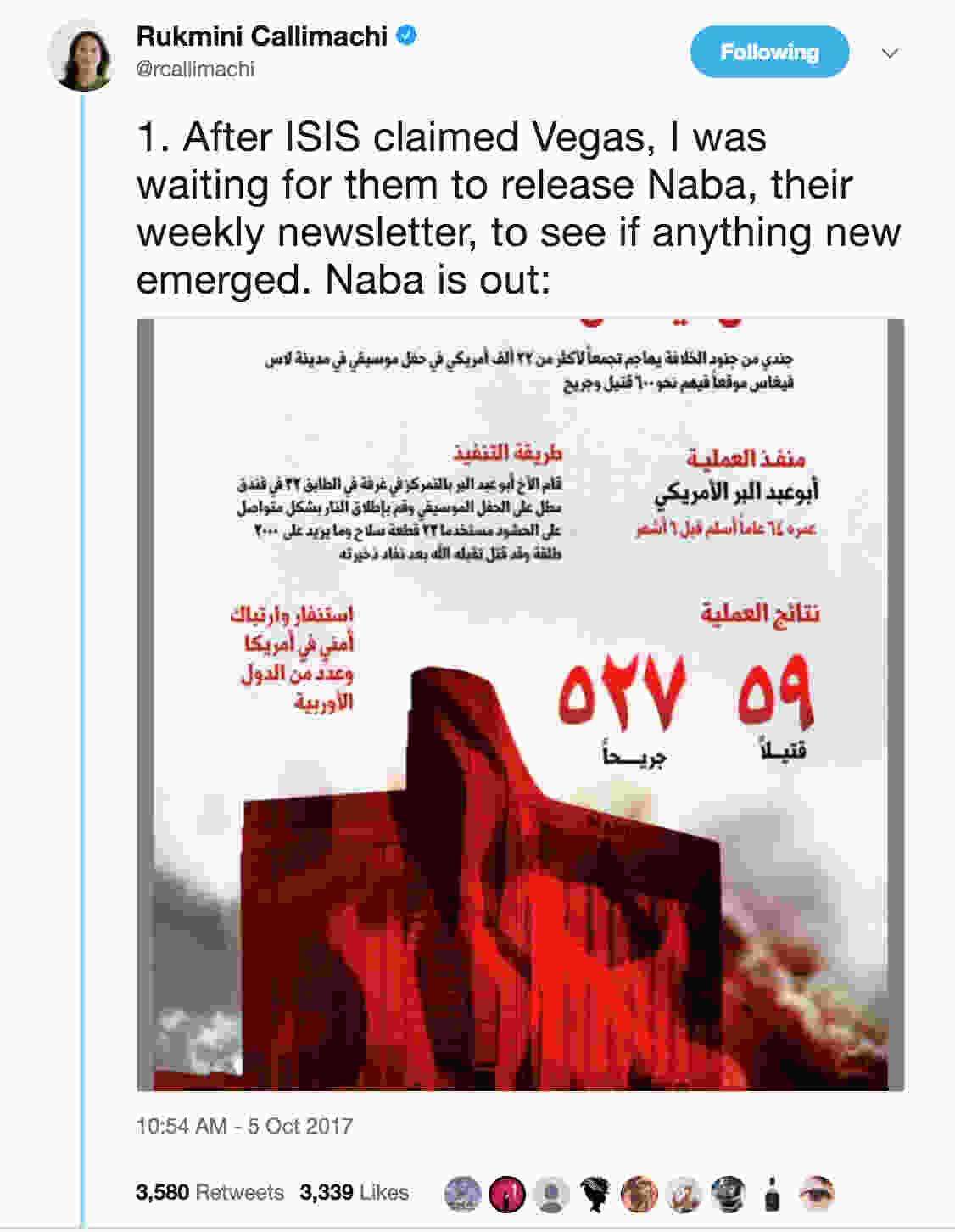 Additionally, ISIS doubled down on their claim in their weekly newsletter, Naba, released on October 5th, 2017, which rehashed details of the attack under a blood drenched image of the Mandalay Bay Resort and Casino.